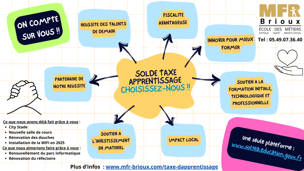 En versant le solde de la taxe d’apprentissage à notre établissement, vous contribuerez donc au financement de dépenses de fonctionnement et d’investissement en matériel pour nos formations initiales, technologiques et professionnelles. À ce titre, nous vous rappelons que la MFR de Brioux sur Boutonne est habilitée à percevoir ce « solde ».